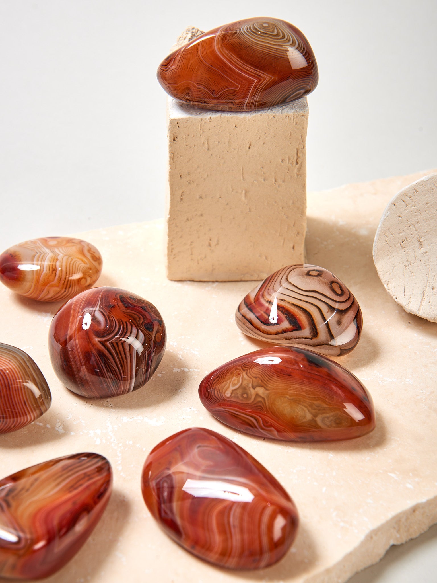 Ihre Maserung ähnelt Landschaften, man kann ganze Welten darin entdecken: Wüsten, Berge, Korallenriffe oder Atolle, der Fantasie sind keine Grenzen gesetzt. Und genau das ist ihre Einladung: "Sei neugierig auf die Welt, die dich umgibt. Es gibt immer noch eine Schicht freizulegen, einen neuen Weg zu gehen, eine unbekannte Ecke zu entdecken." Wir empfinden es so, dass die kräftigen, erdigen Farben dieser Achate stark erden und Kraft und Energie spenden.