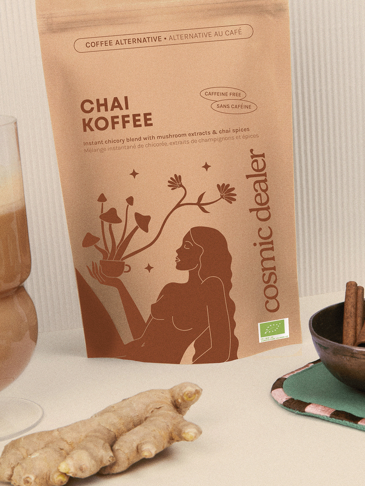 Der Chai Koffee von Cosmic Dealer ist mit biologischen Pilzextrakten, wie dem hochwertigem Lion's Mane, angereichert und macht den Drink zum absoluten Superfood.