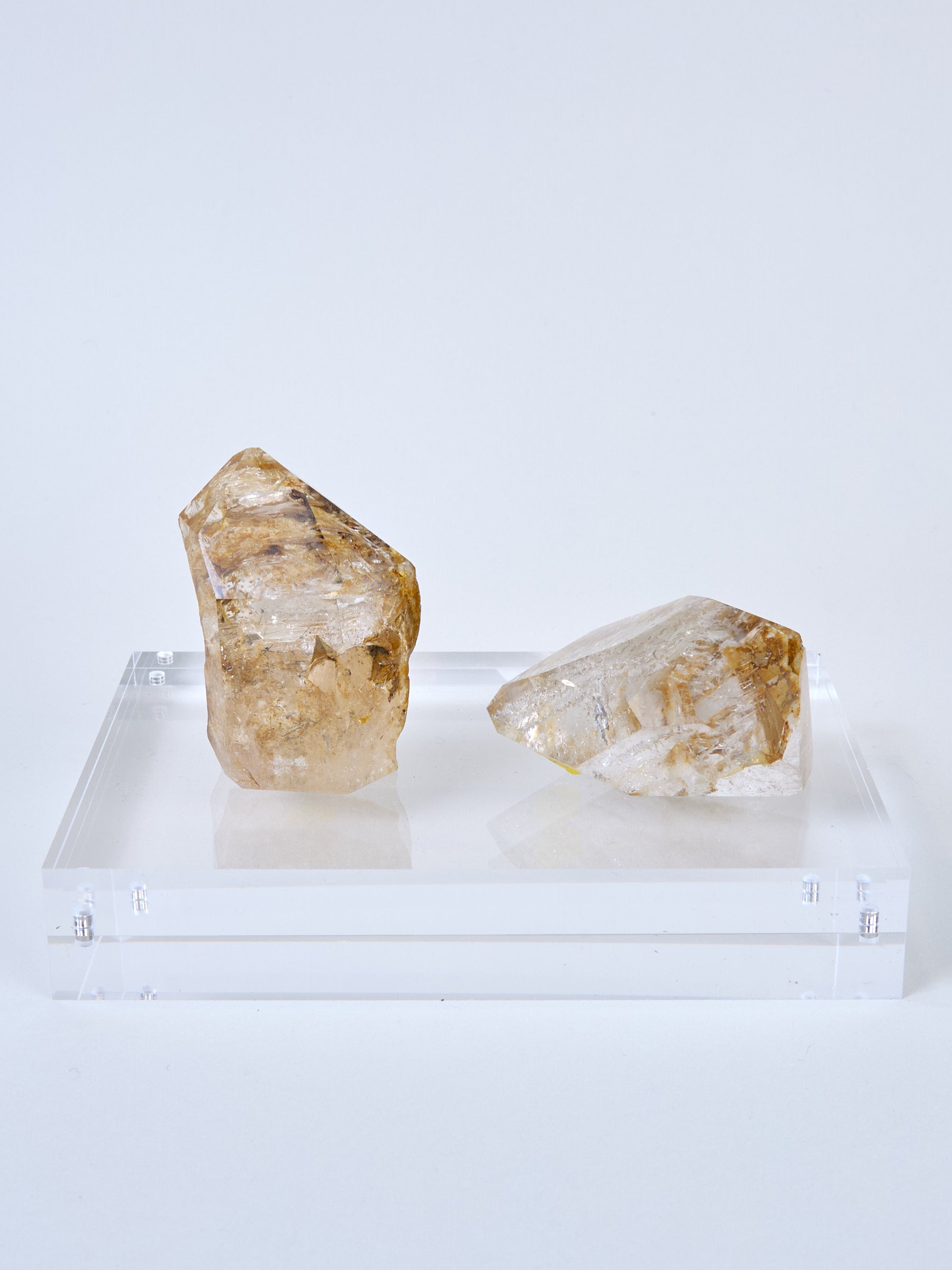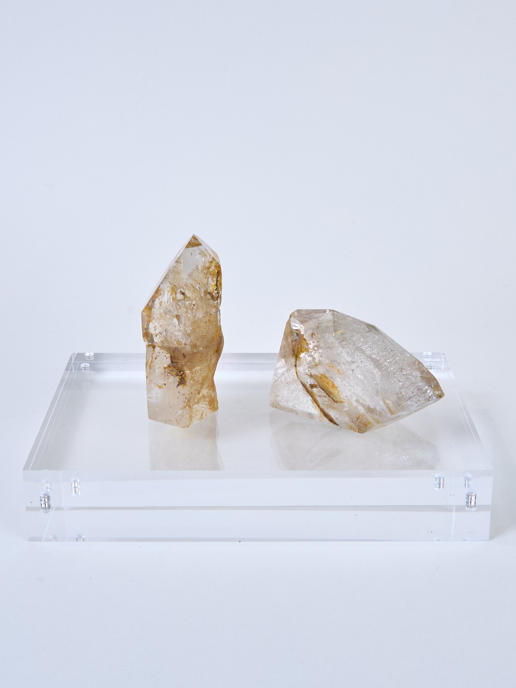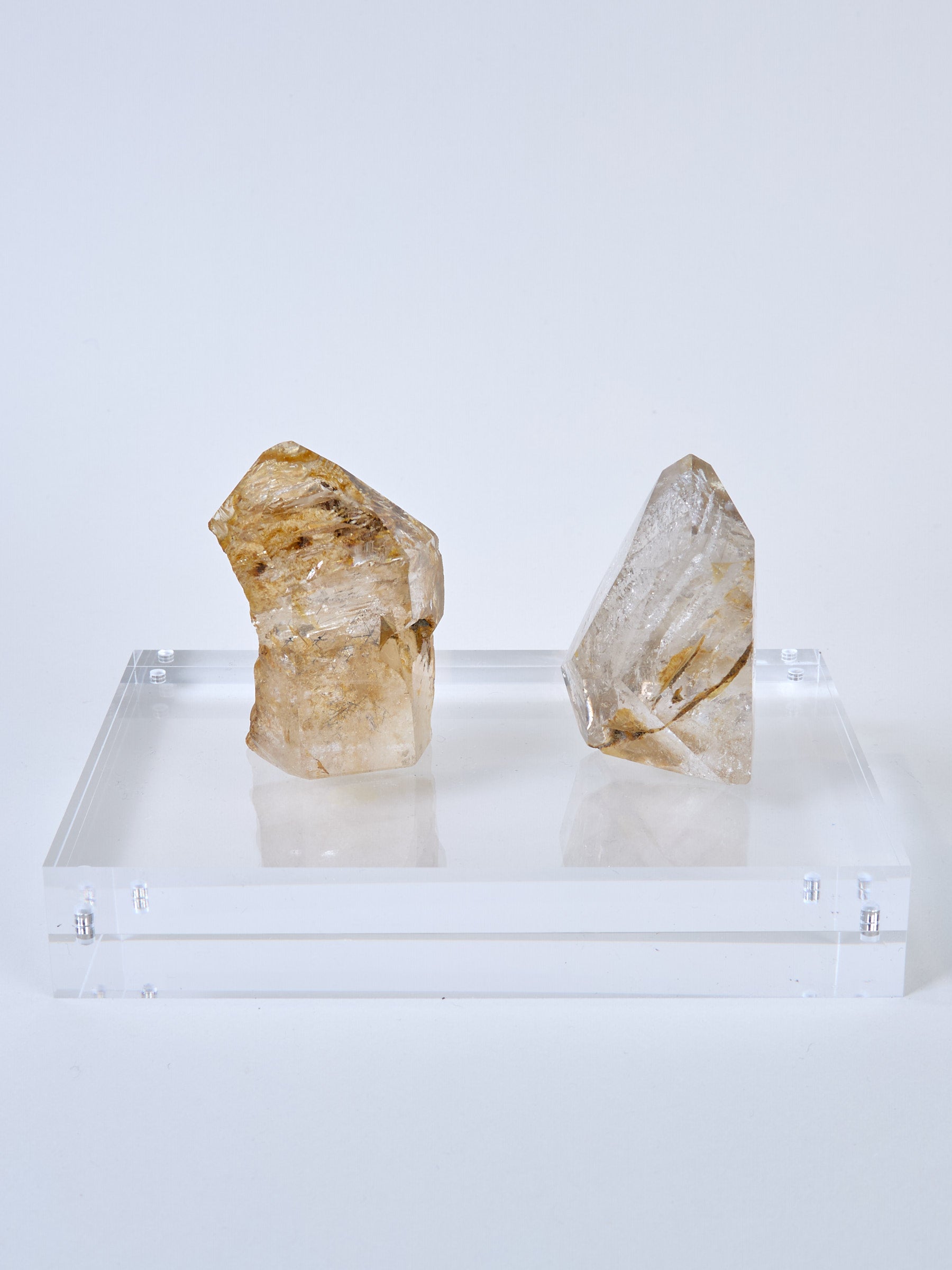 Diese Kristalle sind Inklusionsquarze (oder auch Schamenquarze genannt) und haben ein wahrhaft lichtvolles Strahlen. Ihr außergewöhnliches Innenleben offenbart ganze Welten, die durch Regenbögen durchzogen werden. Man könnte stundenlang in sie hineinschauen und immer wieder etwas Neues entdecken.