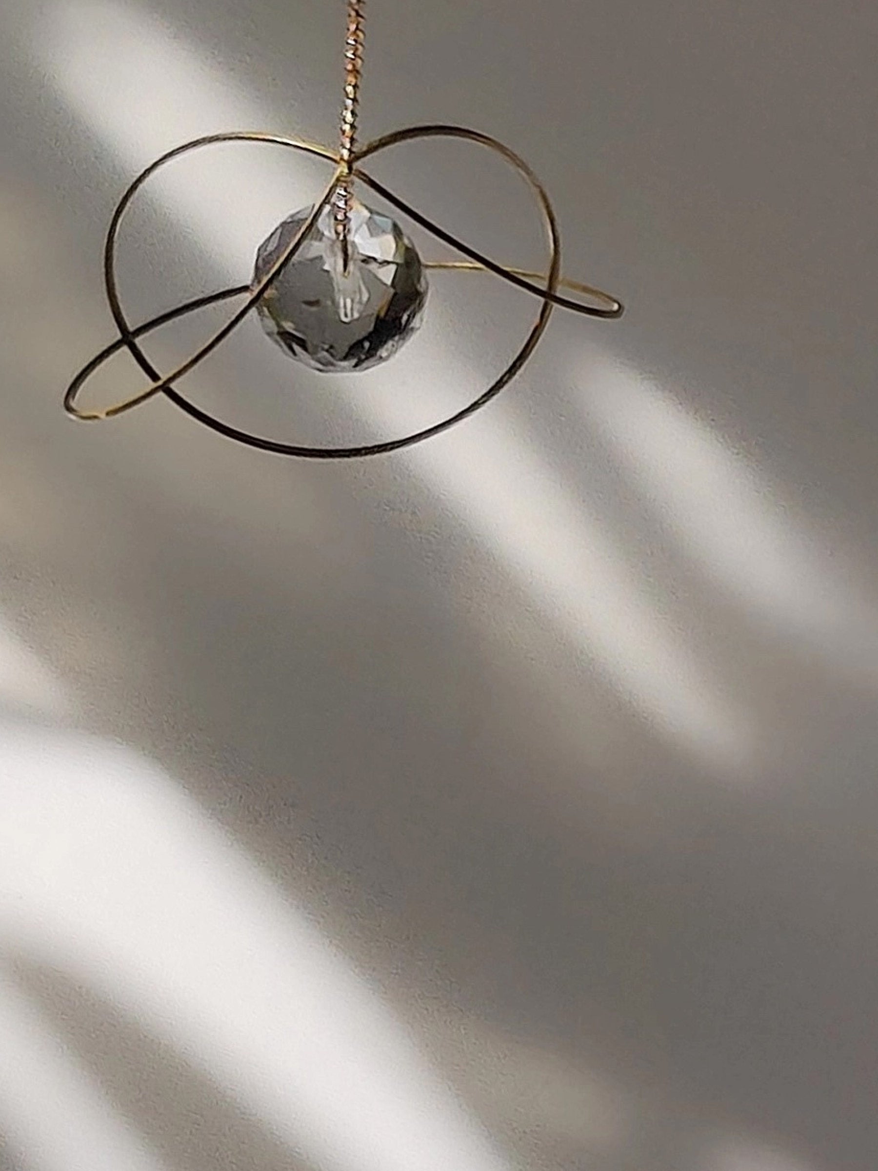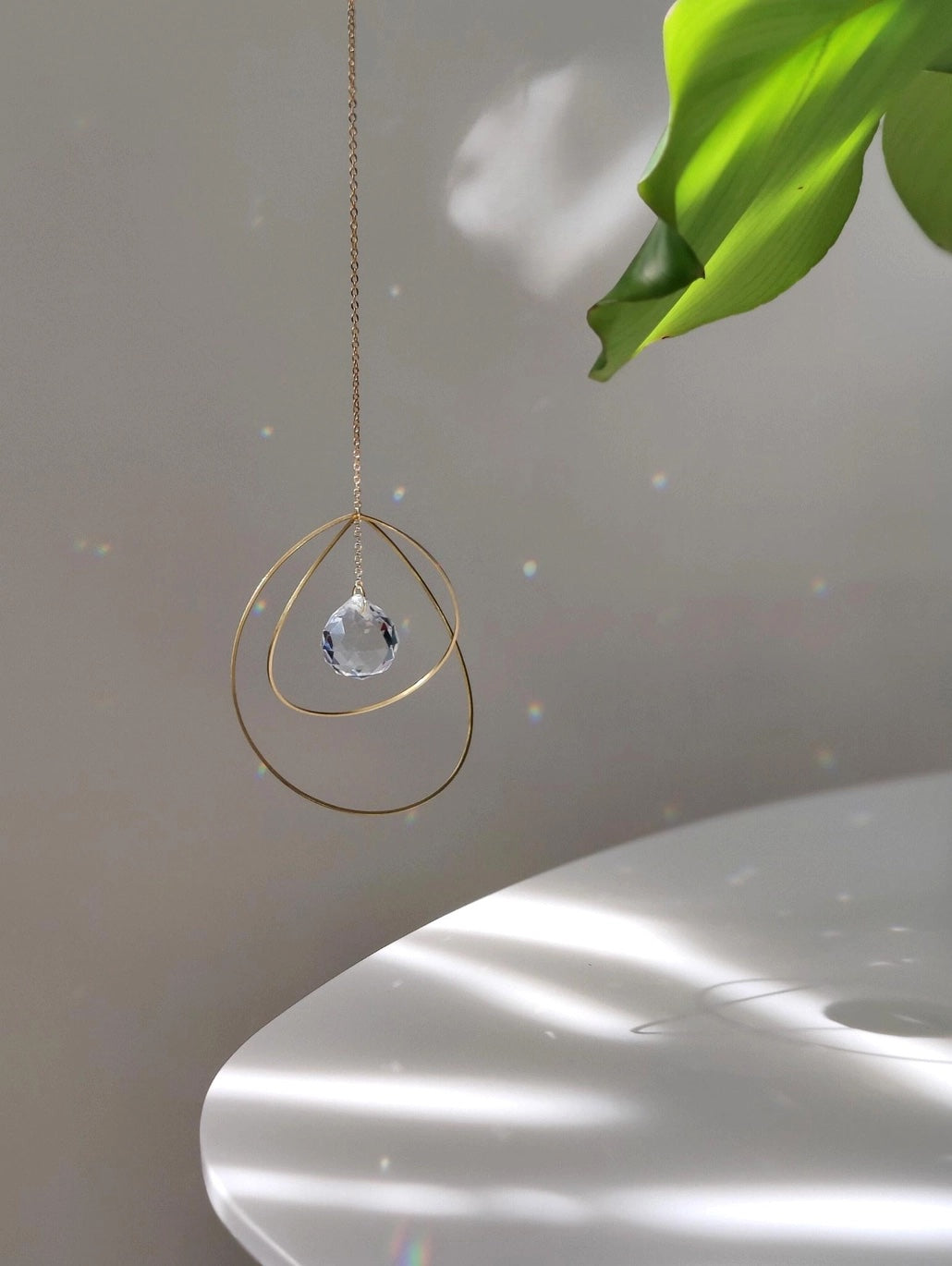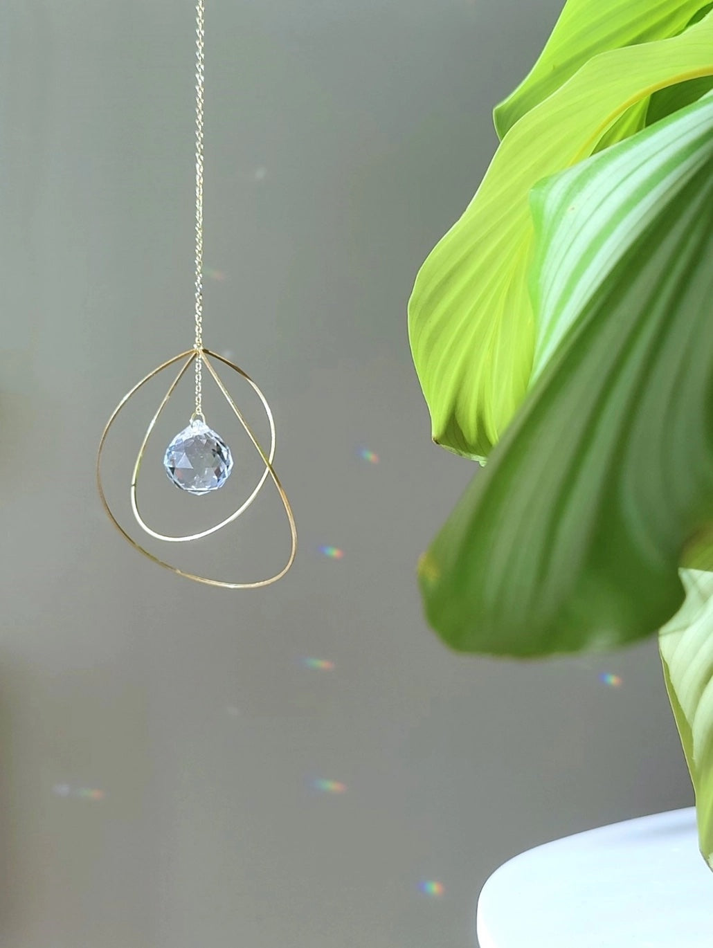Hängend fängt er das Licht ein und verbreitet subtile Regenbögen, wo auch immer das Licht hinmöchte.