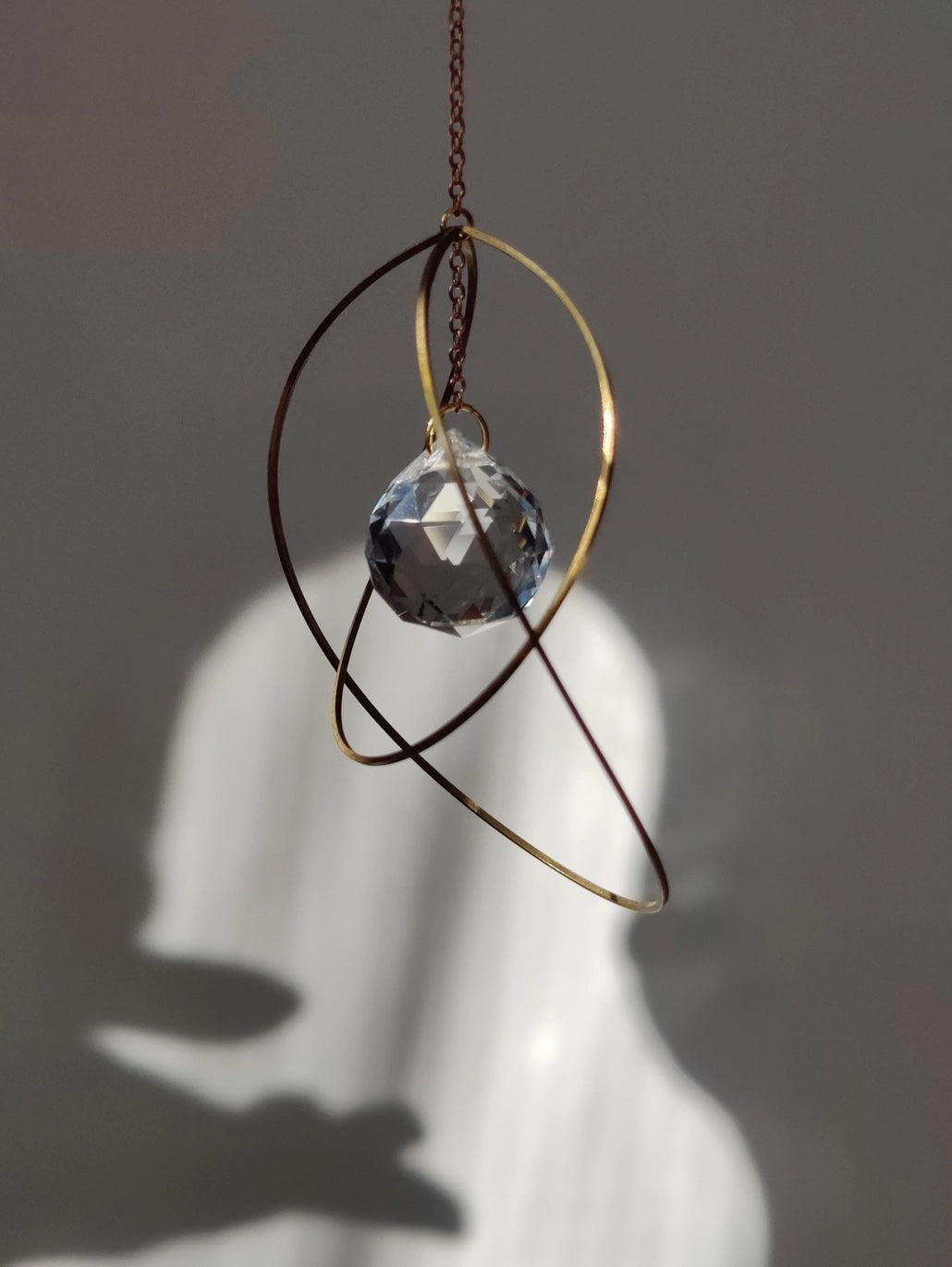 Sonne in unser Leben lassen ist jetzt so leicht! Ether in einem Sonnenfänger, der das Licht bricht und so in allen Farben dein Zuhause in den schönsten Prismenfarben strahlen Seine fließende geometrische Form umschließt einen facettierten Kristall, der das Licht einfängt und in subtile Schimmer verwandelt. Leicht scheint er im Raum zu schweben und bringt eine beruhigende und wechselnde Präsenz.