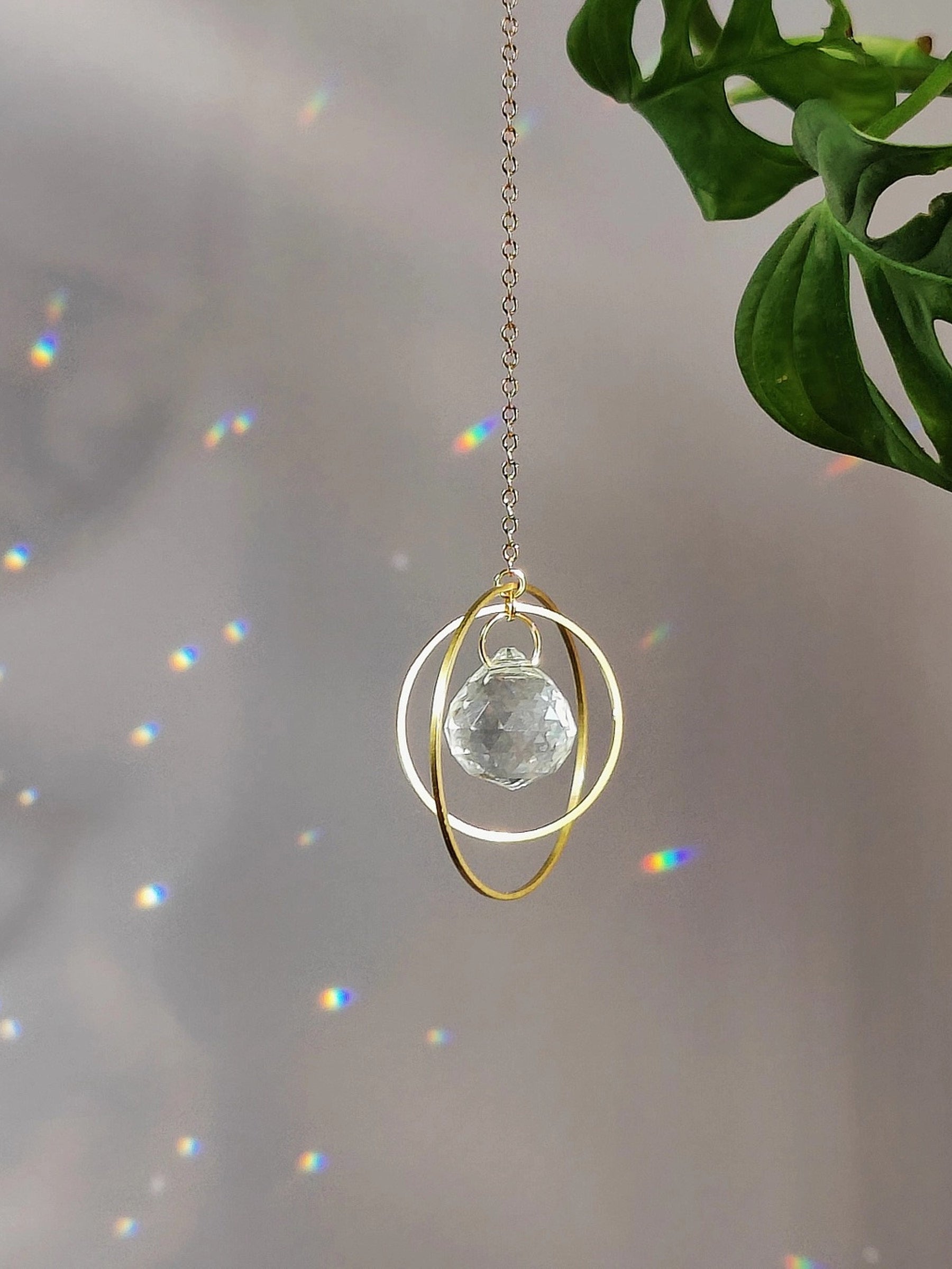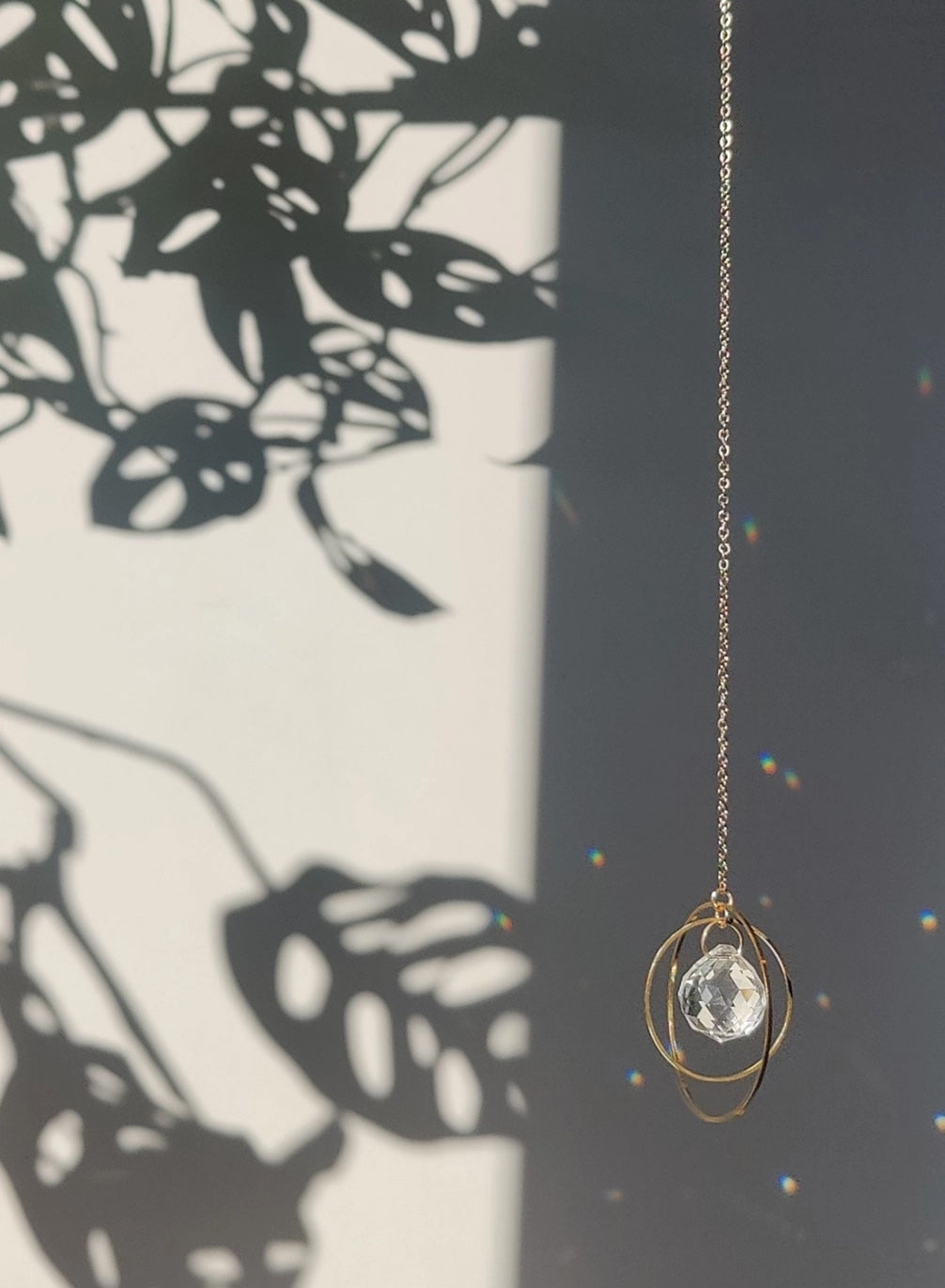 Hängend fängt er das Licht ein und verbreitet subtile Regenbögen, wo auch immer das Licht hinmöchte.
