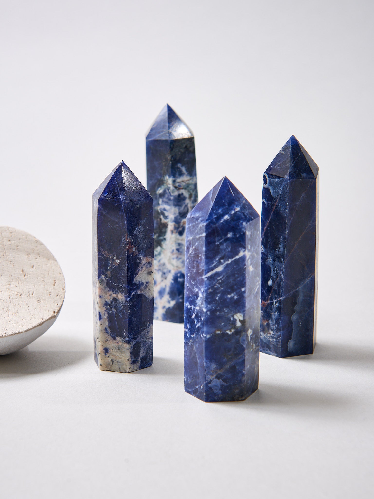 Diese Sodalith Spitzen sind von einem tiefen Blau, das von weißen Adern durchzogen wird. Das macht sie optisch sehr ansprechend und auch energetisch schafft Sodalith eine erhabene Atmosphäre im Raum. In unserer Wahrnehmung bringt er ein Gefühl von Weite und Offenheit, in der sich Verwirrungen klären und sich unsere Visionskräfte entwickeln können.